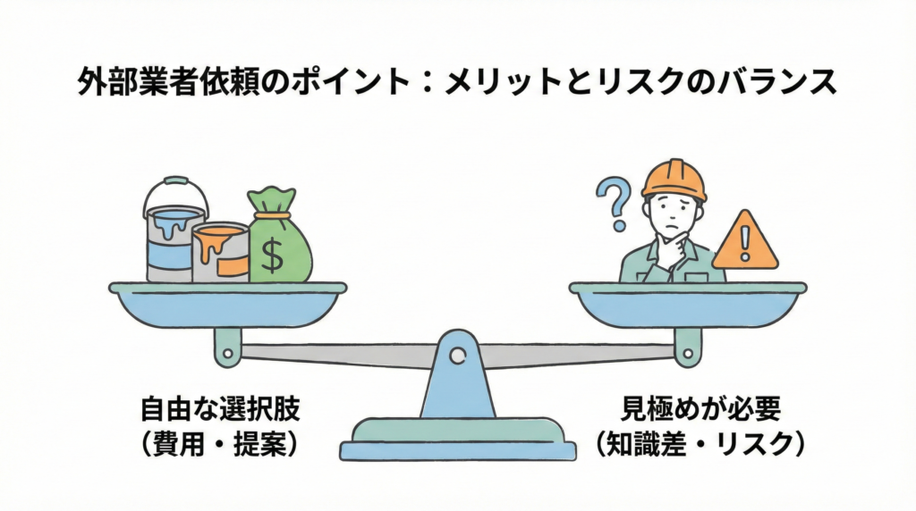 「自由度が高い反面、見極めが重要になる」のが外部業者依頼の特徴です。