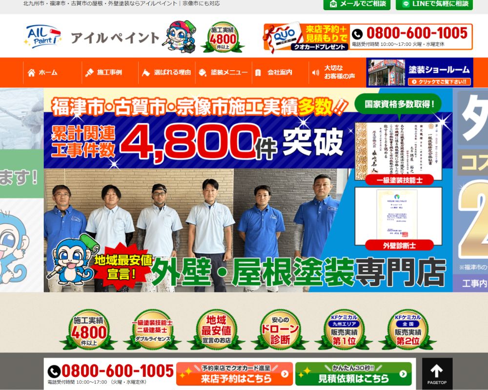 アイルペイントは、北九州市・福津市・古賀市・宗像市を中心に、累計4,800棟以上の施工実績を持つ外壁・屋根塗装の専門店です。